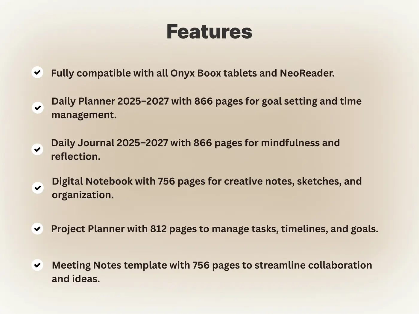 Take control of every day with the Boox Productivity Bundle, a carefully crafted collection of five professional templates built for Onyx Boox tablets. Designed for creators, professionals, and planners alike, this all-in-one package transforms the way notes, projects, and goals are managed.
