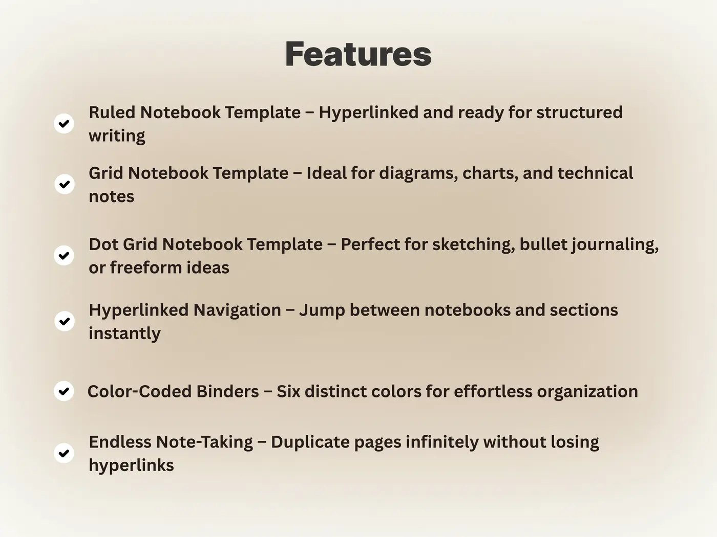 Unlike standard note templates, Infinite Notes is designed to grow with ideas. Each notebook starts with a clean layout — ruled, grid, or dot grid — and allows you to duplicate pages infinitely while keeping hyperlinks functional. From project planning to lecture notes or creative journaling, it adapts to every workflow and planning style.