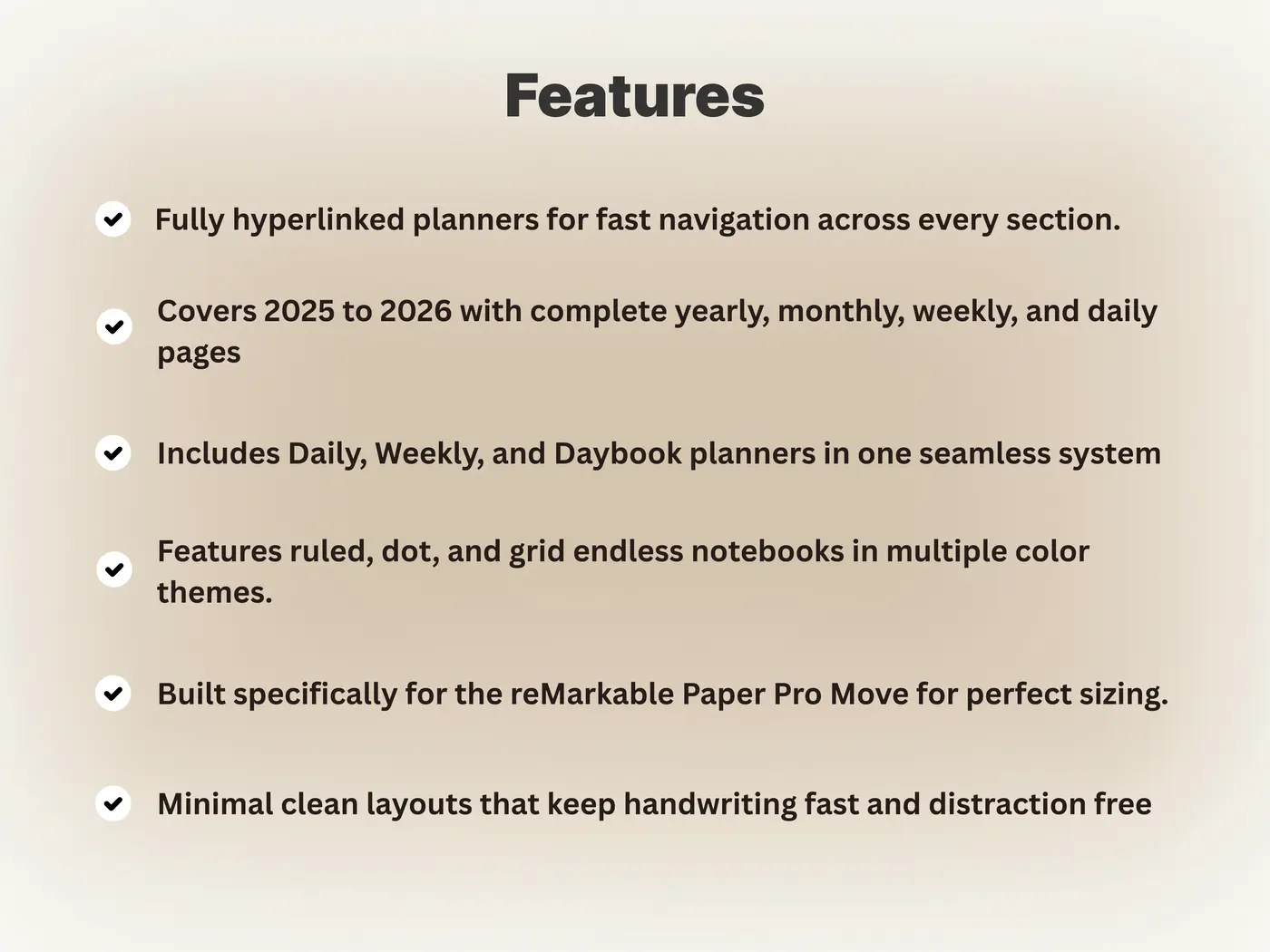 The Ultimate Template Bundle for reMarkable Paper Pro Move is built for planners who want everything in one place. Covering 2025 and 2026, this bundle brings together a fully hyperlinked Daily Planner, Weekly Planner, Daybook Planner, and an entire Endless Notebook Suite. It creates a complete planning environment that supports long term vision, structured routines, and clean note taking without distractions. Whether managing work projects, personal growth, academic planning, or multiple responsibilities, this bundle delivers a seamless flow across every page.